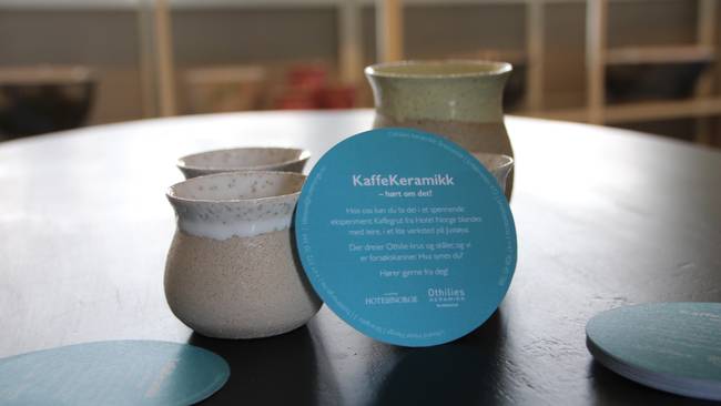The tableware is tested at one of the restaurants of Hotell Norge in Lillesand. The guests are given a small piece of paper with information about the experiment. In return, Gullaksen receives coffee grounds from the hotel, which are turned into new cups and vessels.
