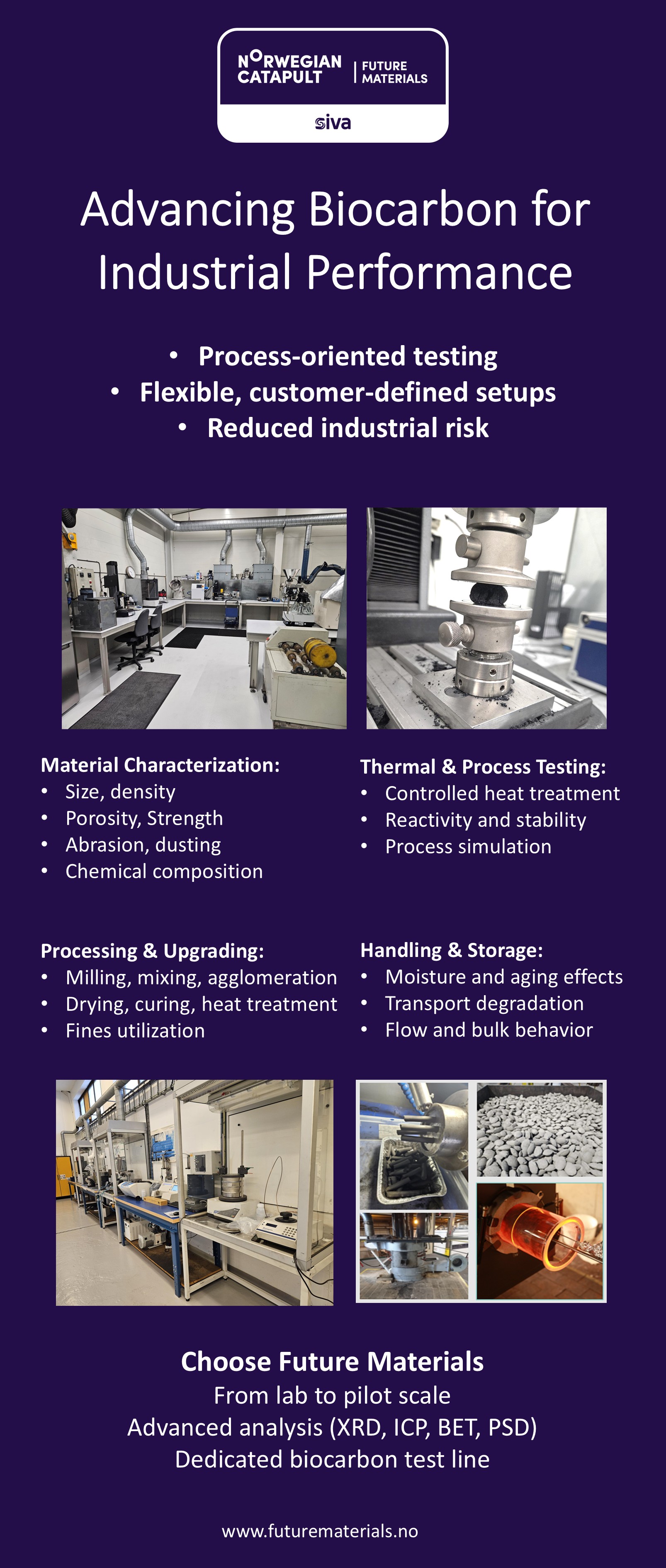 Future Materials tilbyr teknologi, utstyr og optimaliserte prosedyrer for preparering, analysering og karakterisering av biobaserte råmaterialer på pilotskala nivå.